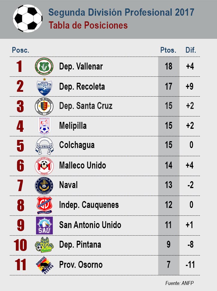 En el primer lugar está Deportes Vallenar con 18 puntos, más 4 goles; Le siguen en el mismo orden: Deportes Recoleta 17 puntos, más 9 goles, Deportes Santa Cruz 15 puntos, más 2 goles, Deportes Melipilla 15 puntos, más 2 goles, Colchagua Deportes 15 puntos, 0 gol de diferencia, Malleco Unido 14 puntos, más 4 goles, Naval 13 puntos, menos 2 goles, Independiente de Cauquenes 12 puntos 0 gol de diferencia, San Antonio Unido 11 puntos, más 1 gol, Deportes La Pintana 9 puntos, menos 8 goles y Deportes Osorno 7 puntos, menos 11 goles./ (JEB)