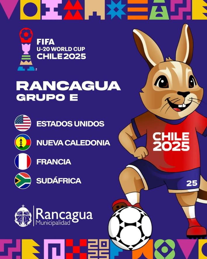Finalmente el comité organizador determinó que el estadio El Teniente reciba los cotejos del grupo E, en el que participarán las selecciones de Estados Unidos, subcampeón del clasificatorio de la CONCACAF, Nueva Caledonia, debutante en esta competición y subcampeón del clasificatorio de Oceanía, Francia, subcampeón europeo del torneo sub 19 de la UEFA y Sudáfrica, quien llegará a Rancagua como el campeón del campeonato clasificatorio de África.