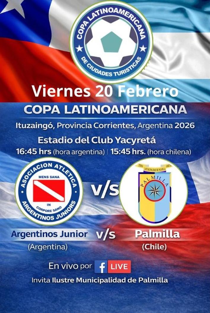 El certamen se inicia el día viernes con el partido entre Palmilla ante Argentinos Juniors, partido programado para las 15.45 horas (hora de Chile), el torneo se extenderá hasta el 26 de febrero, la Copa Latinoamericana de Ciudades y Municipios Turísticos Emergentes es organizada por la Federación Latinoamericana de Ciudades Turísticas y en el que participarán equipos de Argentina, Bolivia, Chile, Paraguay, Perú y Uruguay, siendo Palmilla el único representante de nuestro país en el evento, las plataformas digitales de la Municipalidad de Palmilla estarán dando a conocer todas las novedades del torneo, además de transmitir vía Facebook Live los partidos en directo desde Argentina.