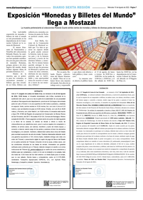 Rolando Duarte, ha cauti- la historia, tanto de nues- Ante el 2º Juzgado de Letras de San Fernando , se rematará, el día 7 de Septiembre de 2022,