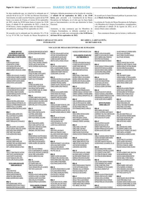 la Ley N°18.700, Los Vocales de Mesas Receptoras de del lunes 05 de septiembre de 2022.