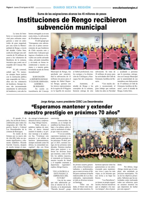 con la institución pública SUBVENCIÓN dad la subvención de 15 ción de Colchagua y Ran- las actividades del Club de mos en Concejo Municipal