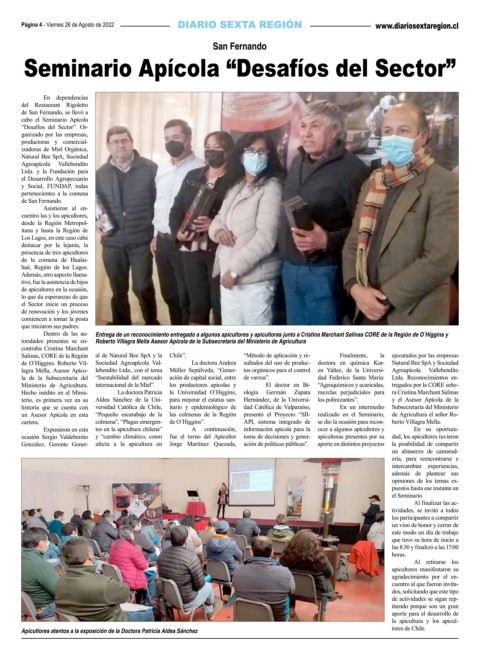 de O´Higgins. Roberto Vil- Sociedad Agroapícola Val- La doctora Andrea sultados del uso de produc- doctora en química Kar- Natural Bee SpA y Sociedad