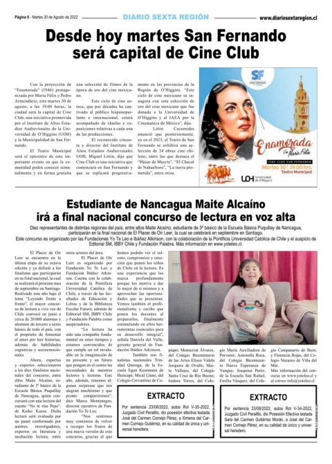 lectura será evaluada por “Nos sentimos José del Carmen Cornejo Pérez, a Ximena del Car- 30-31-1-220829305-06-07 Juzgado Civil Peralillo, dio Posesión Efectiva testada 30-31-1-220829302-03-04
