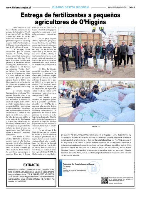 alente a $200.000 en biofertili- región, Fabio López; la senadora por sentencia de fecha 04 de agosto de 2022, se concedió la posesión efectiva de la herencia