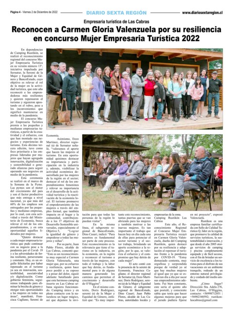 “Quiero destacar empoderar a todas las mu- nosotros es fundamental de ellas para potenciar el en Carmen Gloria Valen- servicios turísticos, la sus-