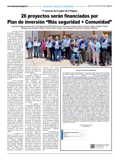 licías, nos van a llevar nal Subdere O’Higgins, sus proyectos, los subie- de la subasta deberá ser pagado al contado dentro del plazo de 5 días hábiles contados
