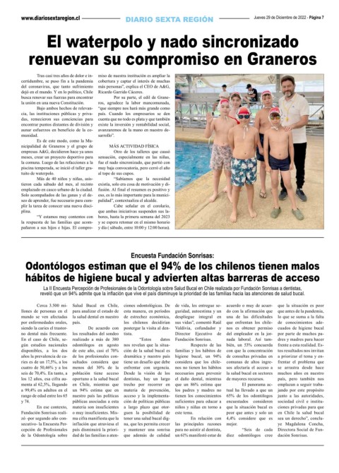 Fundación Sonrisas reali- o muy insuficientes. Mis- guen la posibilidad de este tema. peor que antes y solo un en Chile la salud bucal