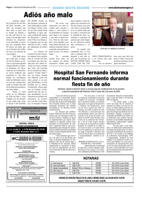 Avisos legales y Publicitarios 31 Carlos Guzmán Baigorria Chillán N° 595-A 722373066 9:00 a 15:00 hrs. (Lunes a Viernes)