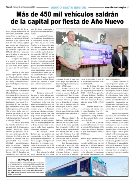 “Junto a Carabineros, Medidas para el fin de semana Por otra parte, el mi- el retorno del 2 de enero, ha- peajes automatizados que he-