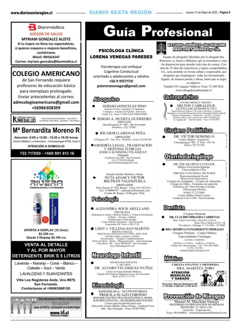Av. Manuel Rodríguez #727. San Fernando. Horas: