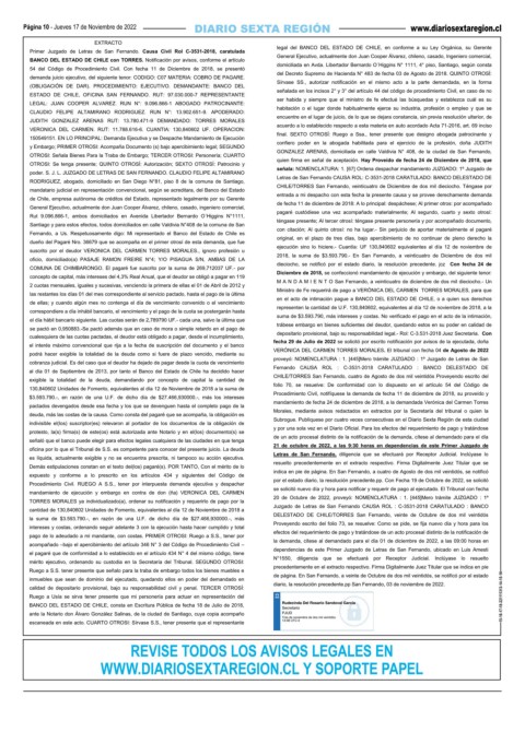exigible la totalidad de la deuda, demandando por concepto de capital la cantidad de CHILE/TORRES San Fernando, cuatro de Agosto de dos mil veintidós Proveyendo escrito del