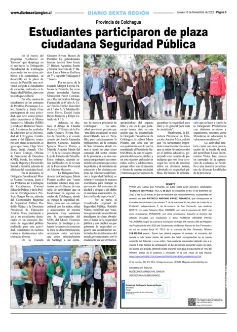 fecto Sergio Torres, además cuelas de Colchagua, donde ños y niñas de la provincia”. Población Independencia 5, de la comuna de San Fernando, que deslinda