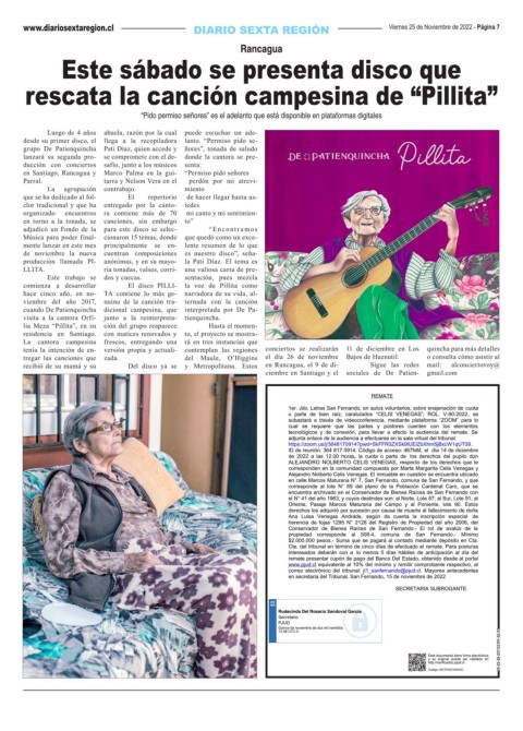 visita a la cantora Orfi- junto a la reinterpreta- tienquincha. o parte de bien raíz, caratulados “CELIS VENEGAS”; ROL. V-90-2022, se