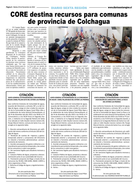 ros de la Comunidad de Aguas Canal Pillan Alto a ros de la Comunidad de Aguas Canal Pillan Bajo a digo de Aguas, vengo en citar a todos los comune-