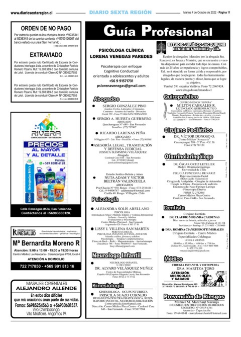 Por extravío queda nulo Certificado de Escuela de Con- pslorenavenegas@gmail.com Av. Manuel Rodríguez #727. San Fernando. Horas: