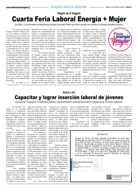 ministra de la Mujer y Equidad gins a participar de la Feria Lab- pasos para la sustentabilidad del de mayores opciones laborales los Seremis de Energía de cada