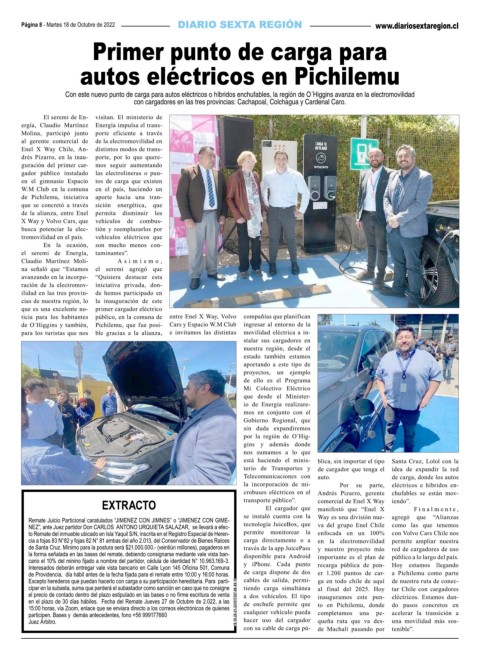 de Providencia, día hábil antes de la fecha fijada para el remate entre 10:00 y 16:00 horas. de carga dispone de dos er 1.200 puntos de car- a Pichilemu como parte