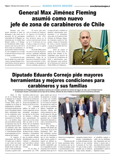 las penas a quienes come- parlamentario por O’Hi- policiales hasta que no fi- bineros, como también de recoja nuestro llamado y diputado Cornejo.