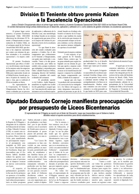 Junto a División Chuquicamata obtuvo el primer lugar sector minería y el premio Excelencia Operacional Chile 2021-2022 en los Kaizen Award Chile.
