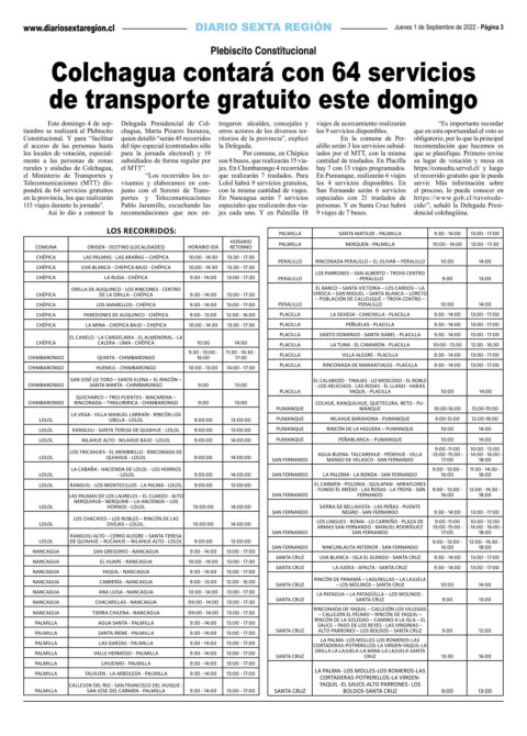 rurales y aisladas de Colchagua, el MTT”. jes. En Chimbarongo 4 recorridos hay 7 con 13 viajes programados. https://consulta.servel.cl/ y luego