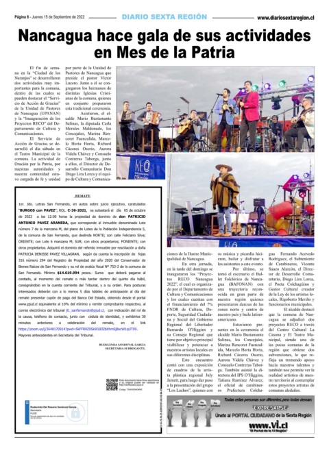 contado, al momento del remate o más tardar dentro del quinto día hábil, tos RECO Nancagua let Folclórico de Nanca- nitario, Diego Lira Lorca,