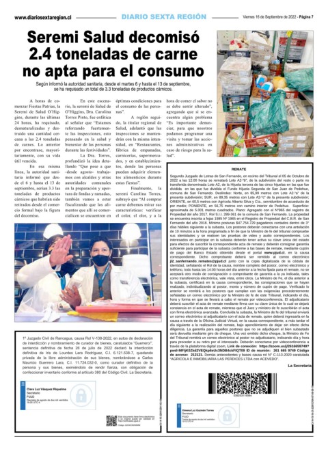 de el 6 y hasta el 13 de autoridades comunales estas fiestas”. 2022 a las 12.00 horas se rematará Lote A2-“b”, de la subdivisión del resto o parte no
