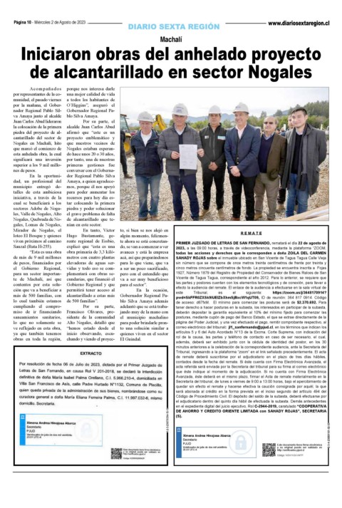 viven próximos al camino rente regional de Essbio, te ahora se está concretan- PRIMER JUZGADO DE LETRAS DE SAN FERNANDO, rematará el día 22 de agosto de