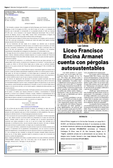 adjudicatario, y para la suscripción del acta, se le remitirá a su Oficina Judicial Virtual el Francisco Encina Armanet, de Las Ca- Regional Pablo Silva Amaya, estas obras