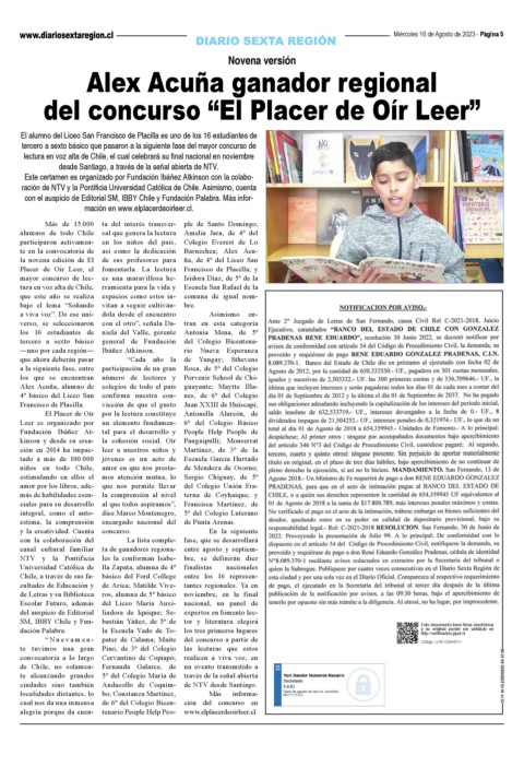 SM, IBBY Chile y Fun- bastián Yáñez, de 5º de tor y literatura elegirá Este documento tiene firma electrónica