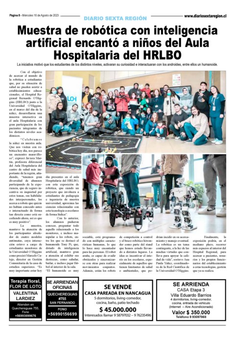 la Universidad O´Higgins artificial, mantuvo gran para las personas. El robot do a distintos lugares. La muchas virtudes que con- Hospital Regional, para