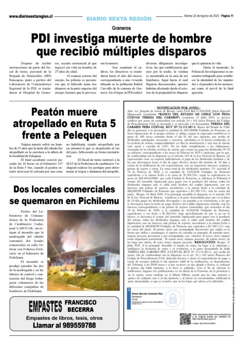 de la Ruta 5 Sur, cuando el peatón in- chapoal realizar los peritajes para deter- contar de la notificaci n de este requerimiento, con sus respectivos intereses, reajustes,