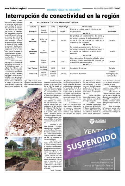 de Población Villa San José se encuentra interrumpi- O´Higgins se trasladaron has- AP operando normal, salvo