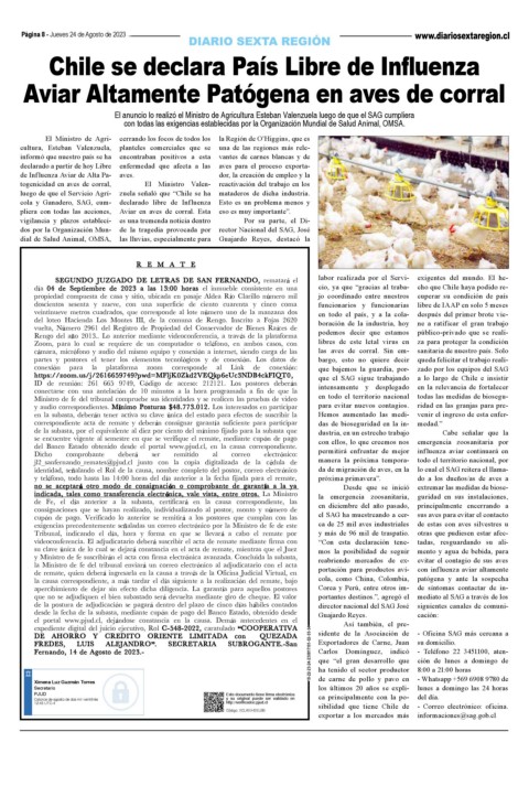d a 0 04 de Septiembre de 2023 a las 13:00 horas el inmueble consistente en una cio, ya que “gracias al traba- cho que Chile haya podido re-