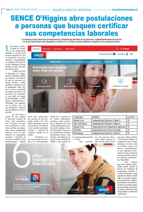 Sence abre postulacio- nando, Santa Cruz, Pal- postulen a estas vacantes Santa Cruz Instalador(a) Eléctrico Clase D 15