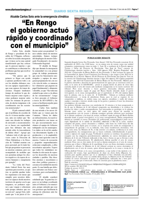 manifestando que hay críticas Gobernador Regional. Segundo Juzgado Letras San Fernando, Luis Amesti 1550 San Fernando rematar 26 de