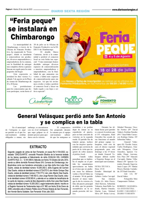 ratulado “DÍAZ/DUARTE”, concedió Posesión Efectiva de la herencia testada el pórtico local. en donde General Ve- taldo; Diego Aravena,