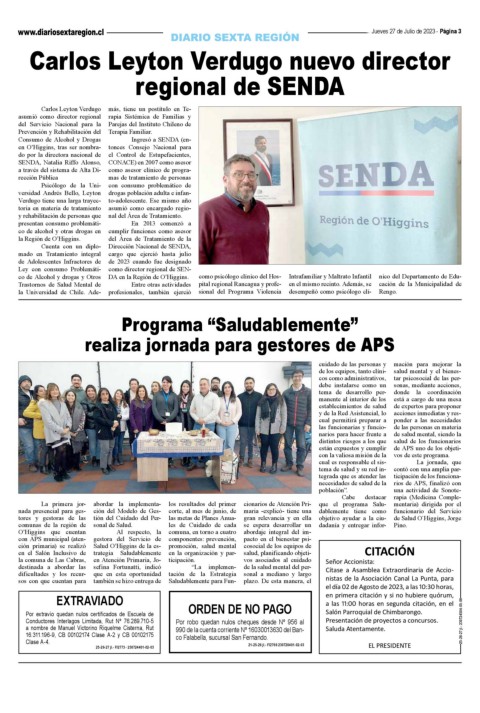 Por extravío quedan nulos certificados de Escuela de ORDEN DE NO PAGO Salón Parroquial de Chimbarongo.