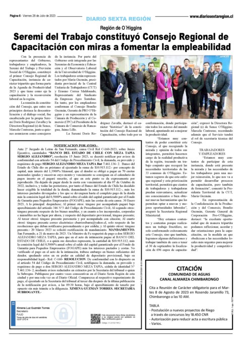 la Subrogue. Publíquese por cuatro veces consecutivas en el Diario Sexta Región de esta 21-25-26-27-230720201-02-03-04 COMUNIDAD DE AGUAS