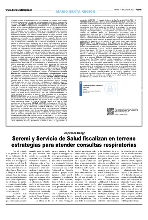 consecutivas en el Diario Sexta Región de esta ciudad y por una sola vez en el