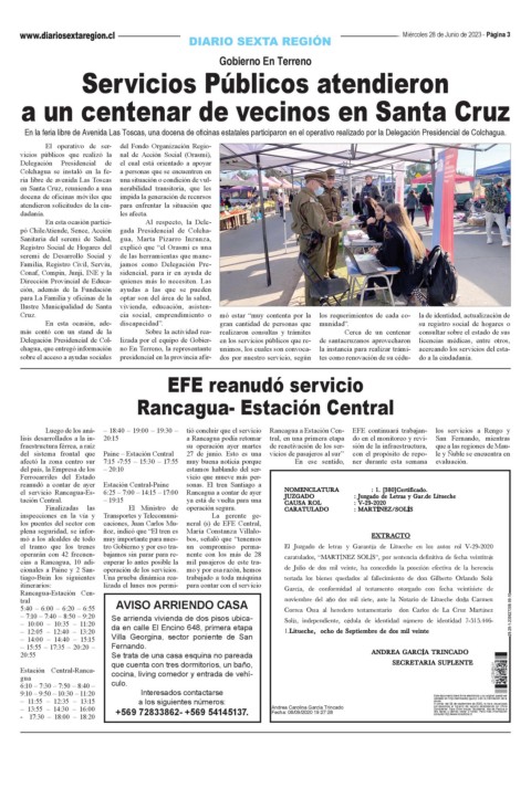reanudó a contar de ayer Estación Central-Paine sonas. El tren Santiago a El Juzgado de letras y Garant a de Litueche en los autos rol V-29-2020