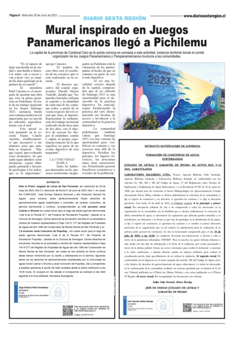 de Aguas del año 1996 del Conservador de Bienes Raíces de San Fernando y b).- Catorce de junio de dos mil veintitrés