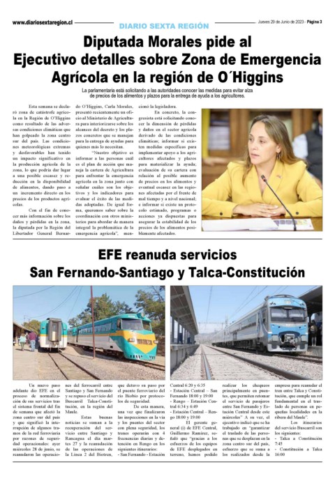 miércoles 28 de junio, se de las operaciones de siguientes itinerarios: de EFE desplegados en esfuerzo que se suma a - Constitución a Talca