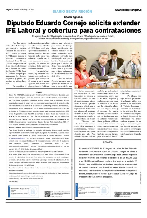 1735 Registro Propiedad 2014 Conservador Bienes Raíces San Fernando. del Estero Guirivilo, a la audiencia a realizarse el día 06 de junio 2023