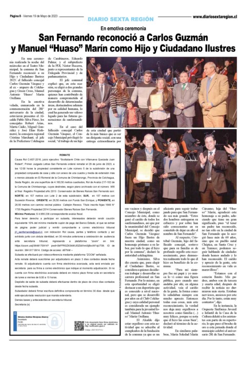 Acta remate deberá suscribirse por adjudicatario en plazo 3 días contados desde fecha al Ciudadano Ilustre, se muna. “Para mí siem- reconocimiento en vida es