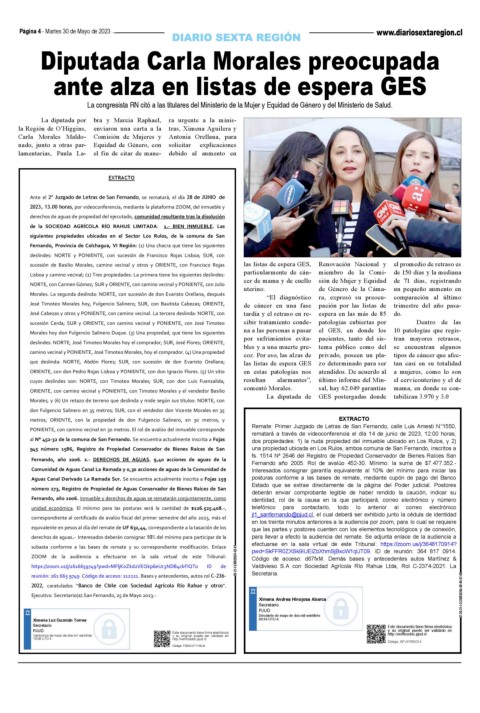 Comunidad de Aguas Canal La Ramada y 0,30 acciones de aguas de la Comunidad de para llevar a efecto la audiencia del remate. Se adjunta enlace de la audiencia a