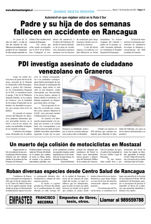 años de edad y su hija de comuna de Rancagua. la altura del kilómetro 81, terminar volcado a un cos- ocupante del vehículo y instruyó a la brigada espe-