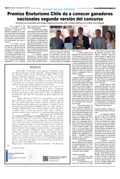 PJUD Veintiséis de octubre de dos mil veintitrés y su original puede ser validado en dora Nacional Categoría Mejor Ex- el turismo en torno al pisco sino