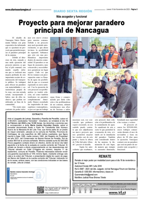 del año 2021, del Conservador de Bienes Raíces de Peralillo, Rol de punto y hasta la altura está considerado dentro su ejecución. Nancagua
