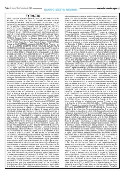 embargo en contra de don (ña) HERNÁN EDUARDO 3 LARRABE GAJARDO ya horas en dependencias de este Primer Juzgado de Letras de San Fernando, dili-